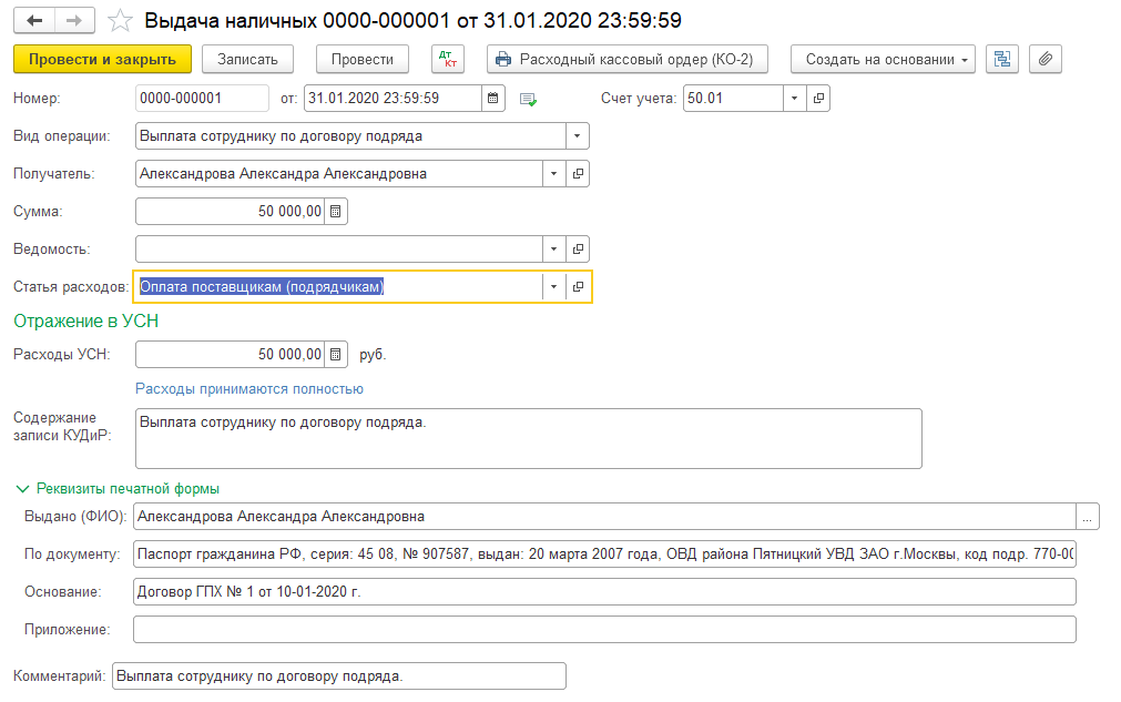 ИП Иванов И.И. заключил с физическим лицом Александровой А.А., не являющимся ИП, договор ГПХ № 1 от 10-01-2020 г. на оказание юридических услуг на сумму 50000 рублей, расчеты производится по окончании договора наличными.