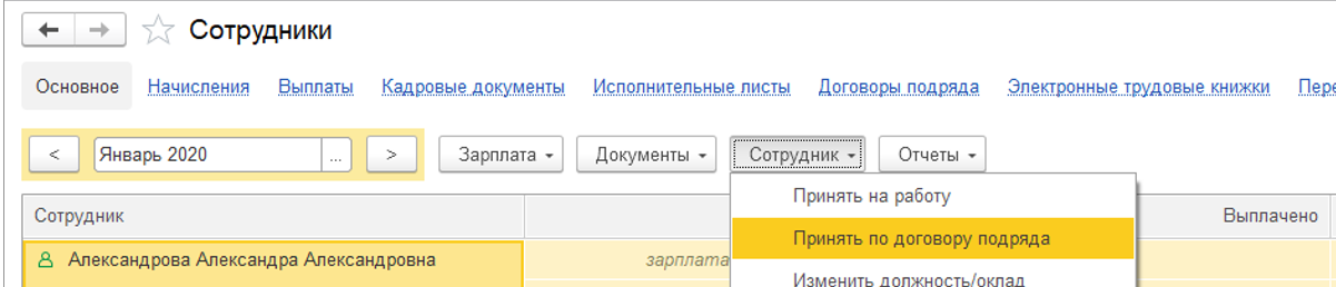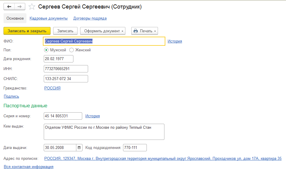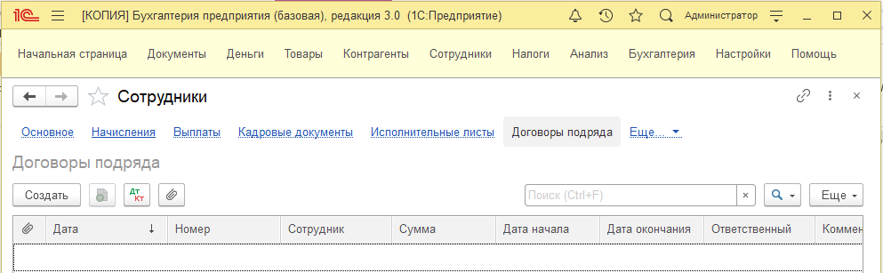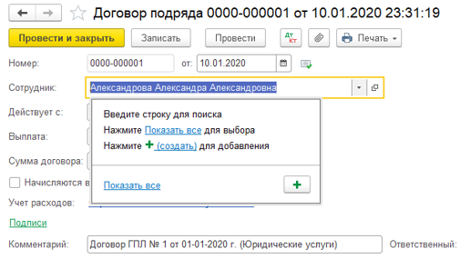 - В контексте формы договора создайте запись об исполнителе ГПД в справочнике «Сотрудники» (Кнопка «+Создать»)