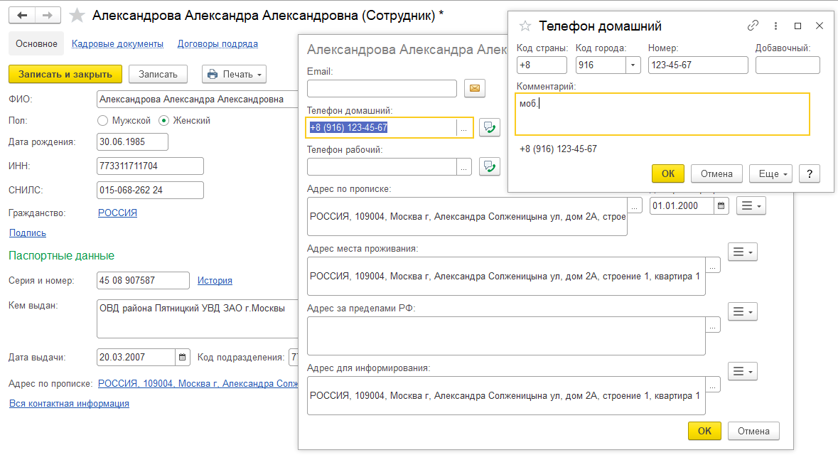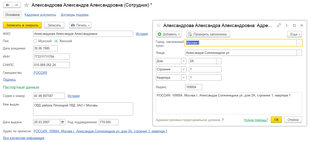 - Заполните персональные данные Александровой А.А., Адрес по прописке введите через специальную форму, используя классификатор адресов КЛАДР.
