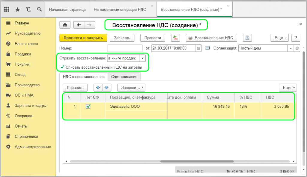 Восстановление НДС при этом будет проводиться по документу с рисунка ниже: