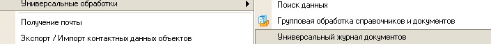 Для использования универсального журнала следует его открыть. Чаще всего его можно найти при помощи меню «Сервис» –> «Универсальные обработки».